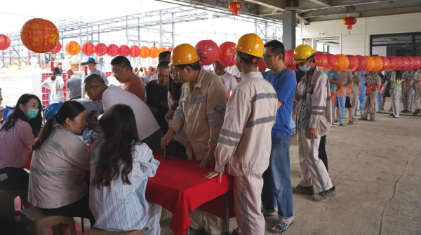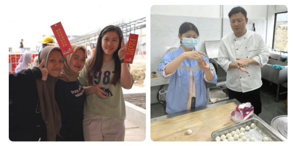 元宵佳節(jié),莫羅瓦利產(chǎn)業(yè)基地食堂門前張燈結(jié)彩,160張燈謎紙條整齊劃一地懸掛在燈籠下面。來自基地各個(gè)部門的中印尼員工互相探討燈謎謎底。微風(fēng)吹來,謎面隨風(fēng)起舞,兩國員工穿梭其間,流連忘返。猜謎結(jié)束后,大家紛紛入座食堂,共享元宵。